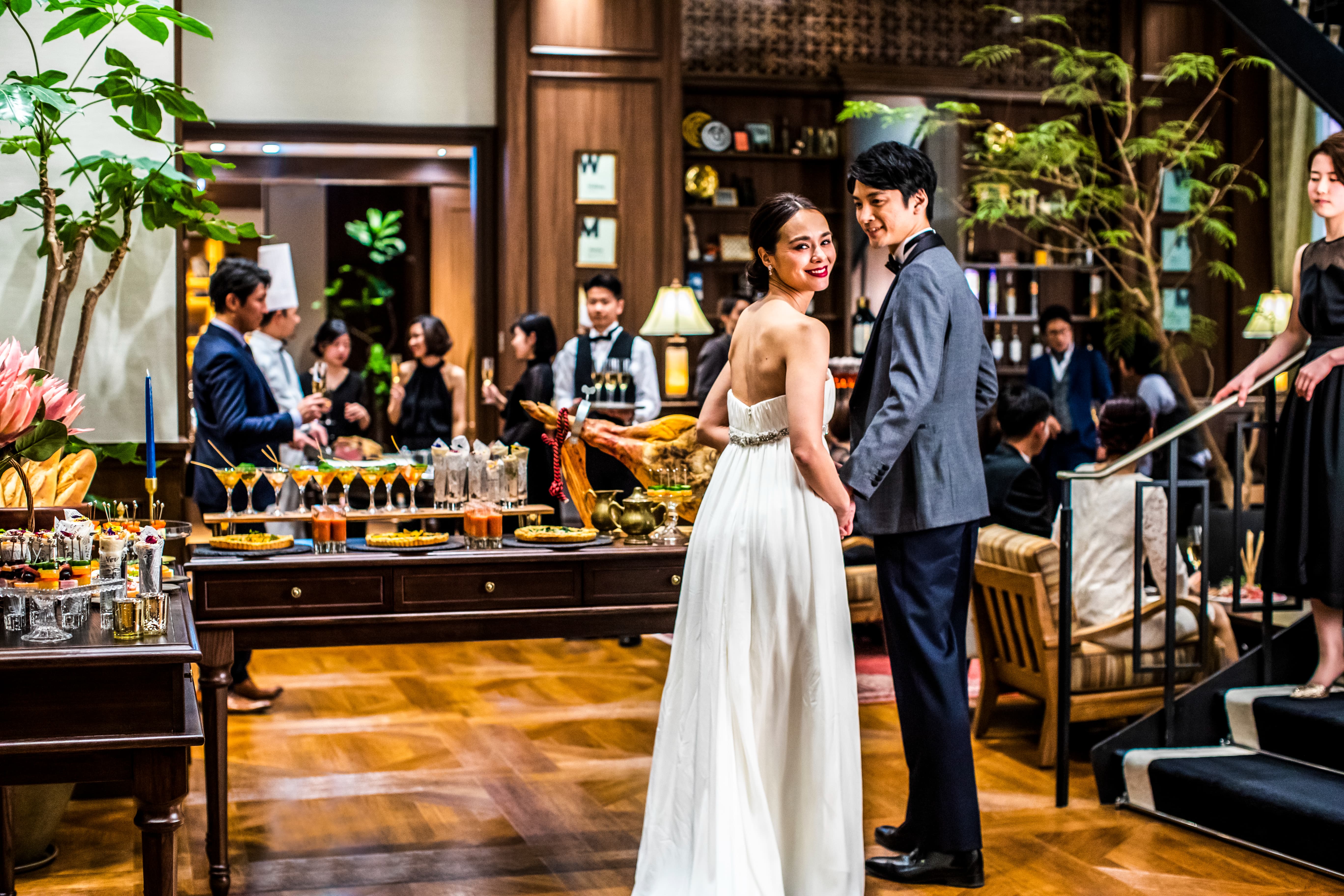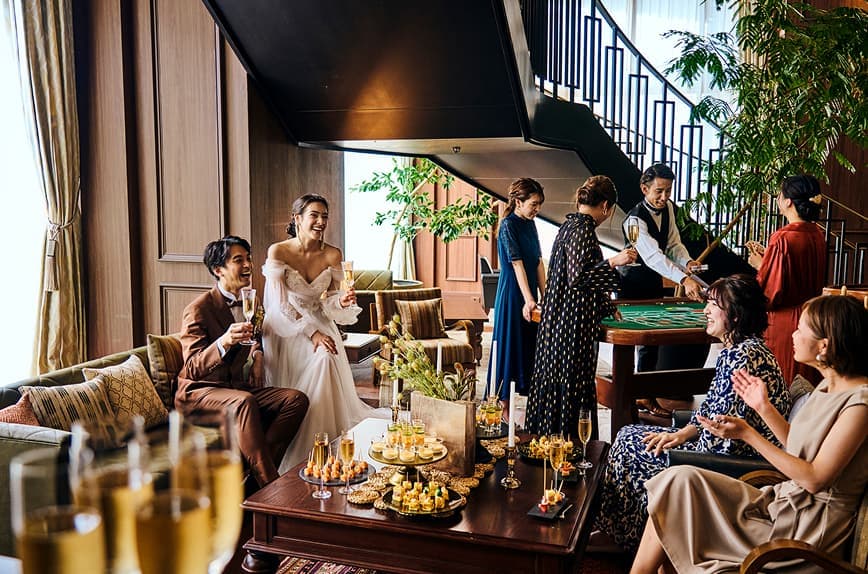 挙式の後は、螺旋階段からのサプライズ登場とともにプレパーティへ。ゲストとドリンクを片手に歓談したり、ミニゲームで盛り上がったり——
